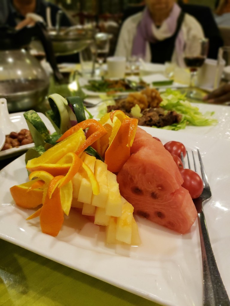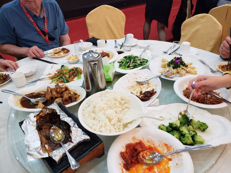 Over eating. The meals in China were family style. We needed a family of 100 to eat all the food.